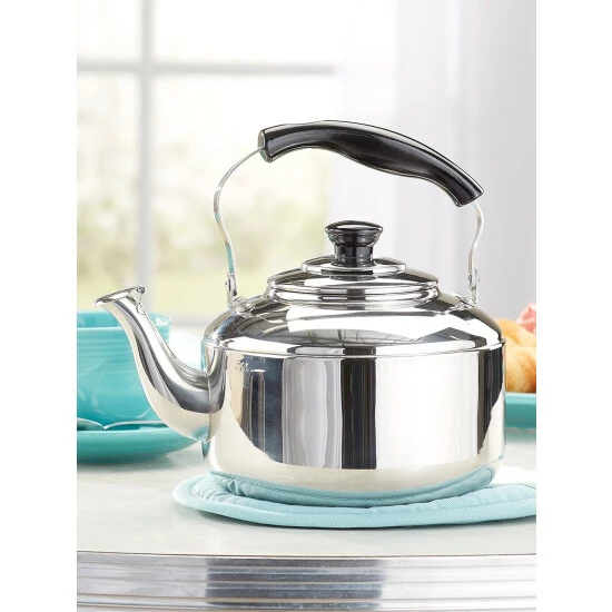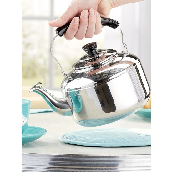 Our classic teakettle looks great and heats water quickly and efficiently, cup after cup. After years of searching for the right quality, we decided to have one made just for us. Ours is guaranteed to last a lifetime and is crafted in durable stainless steel and features a wide base for even heat distribution, a removable lid, a large no-drip spout, and an ergonomic Bakelite handle for a sure grip.