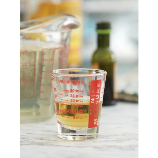 Stop fumbling with kitchen spoons and tiny plastic cups. This easy-to-read shot glass accurately measures teaspoons, tablespoons, ounces, and milliliters. The heavy base reduces the risk of the glass tipping. Holds up to 1 oz.