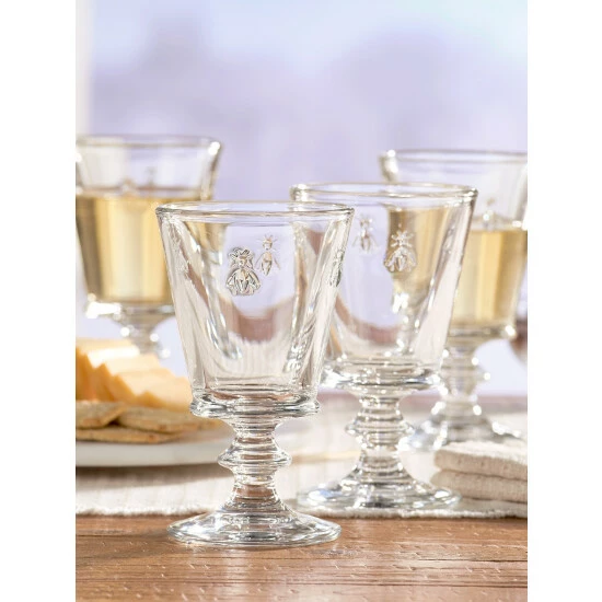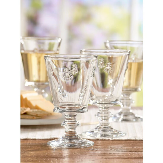 These beautiful wine glasses are made by the oldest glassmaker in France who has been making high-quality artisanal glassware for over 500 years. Each glass is durably crafted and features a raised bee motif. Available in sets of four.