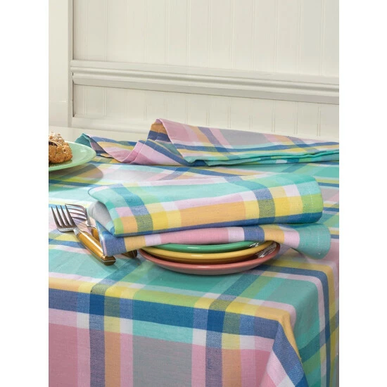 Brighten up your dining table with bright pastels! The tablecloth is beautifully woven in yard-dyed cotton, so the plaid stripes and pastels will stay looking crisp and true for the life of the tablecloth. We think it’s a great addition to kitchen and dining tables, as well as, outdoor and porch tables, too. A set of four matching napkins is sold separately.