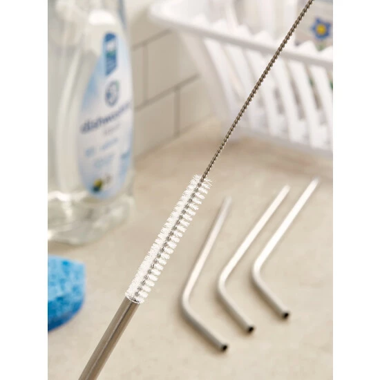With flexible stainless-steel handles and stiff nylon bristles, these brushes are ideal for thoroughly cleaning the inside of stainless-steel straws. Will accommodate straight or angled straws.
