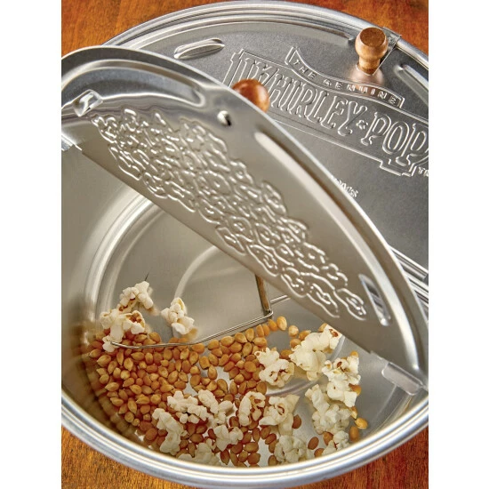 The original Whirley popcorn machine makes popcorn that tastes the way it was meant to, fluffy and flavorful. Every kernel pops, as the popcorn makerβs unique hand crank continuously stirs kernels to distribute oil and prevent burning. Pop the tastiest popcorn imaginable in just 3 minutes while using as little as 1 teaspoon of oil for a healthy, low calorie snack. Simply wipe with paper towel for easy cleanup.
